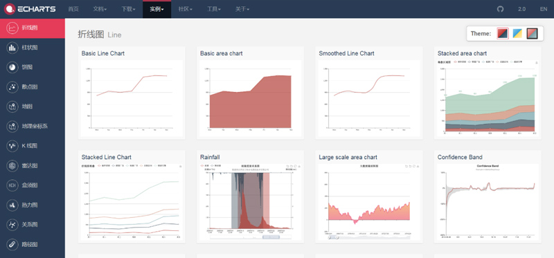 ECharts 提供了常规的折线图、柱状图、散点图、饼图、K线图,用于统计的盒形图,用于地理数据可视化的地图、热力图、线图,用于关系数据可视化的关系图、treemap、旭日图,多维数据可视化的平行坐标,还有用于 BI 的漏斗图,仪表盘,并且支持图与图之间的混搭。